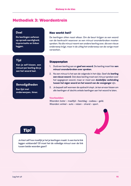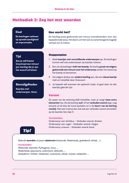 • Leg het uit. Deze methodieken focussen op het oefenen van algemene spreekvaardigheid bij je leerlingen.