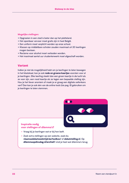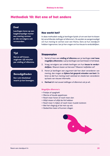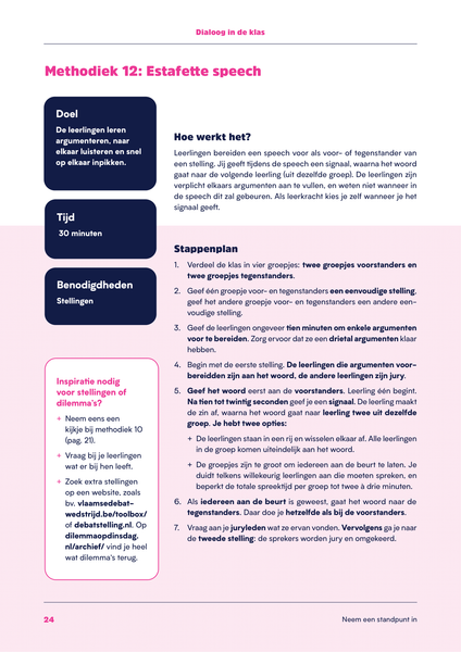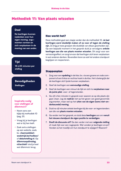 • Neem een standpunt in. In deze methodieken daag je je leerlingen uit om actief een standpunt in te nemen en hun eigen mening te vormen over een onderwerp.
