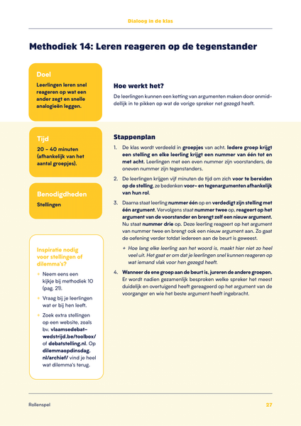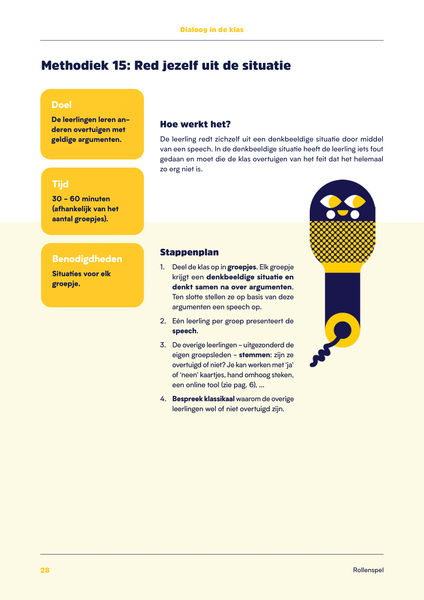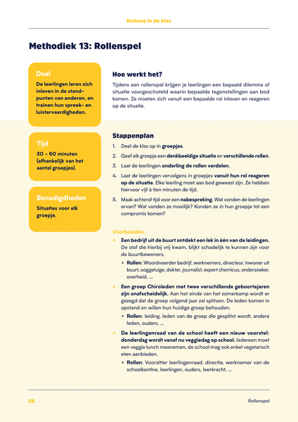 • Rollenspel. Deze methodieken kan je gebruiken om je leerlingen te leren hoe ze zich kunnen inleven en respect hebben voor de mening van anderen.
