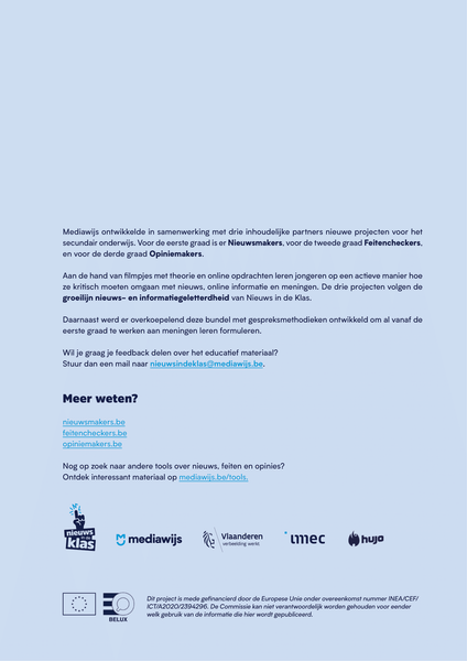 Van zodra we wakker worden tot we gaan slapen is er nieuws. Maar wat is nieuws eigenlijk en hoe wordt het gemaakt? Wanneer is iets nieuwswaardig? Wat doet een journalist juist? Met het Nieuwsmakers lespakket ontdek je alle antwoorden en kan je je leerlingen zelf omtoveren tot echte journalisten.