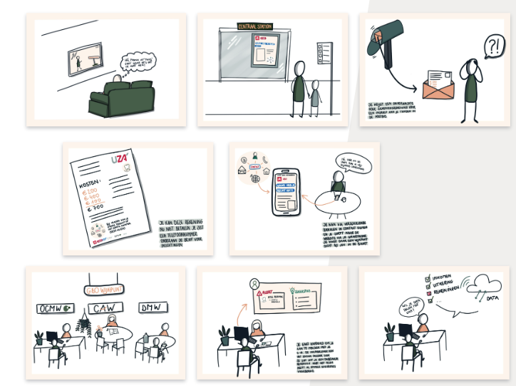 Een storyboard is een manier om de gebruikerservaring stap voor stap te visualiseren met tekeningen of afbeeldingen. Een storyboard vertelt hoe jouw gebruiker de oplossing stap voor stap zal doorlopen.