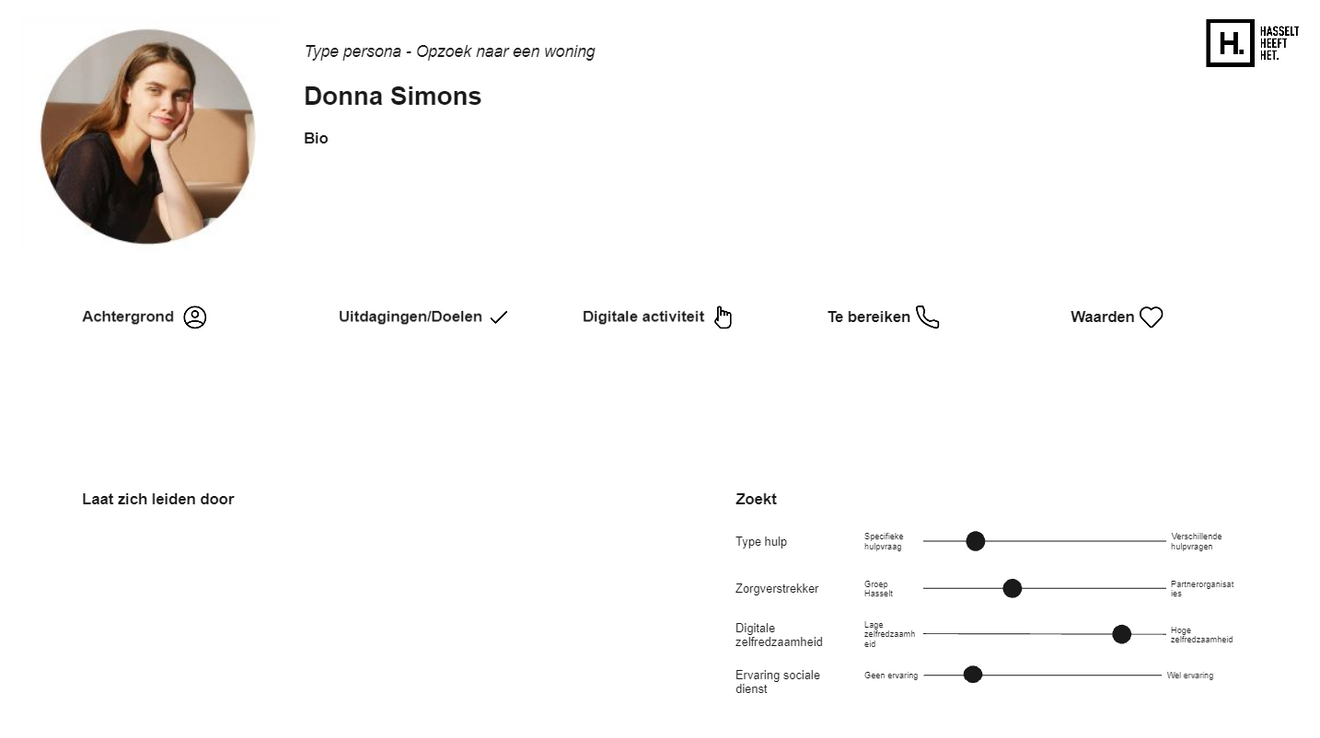 In het kader van een van de experimenten van de City Deal wil Groep Hasselt de dienstverlening voor de sociale dienst gebruiksvriendelijker en toegankelijker maken. In het kader van een LEAN traject hebben we een cliëntenbevraging uitgevoerd en daaruit blijkt dat cliënten online meer handelingen zelfstandig willen uitvoeren. Het project heeft twee doelen: - We wensen enerzijds een goede informatieontsluiting van de sociale dienst: de informatie over producten, diensten en projecten gebundeld, op een overzichtelijke wijze en geschreven in de taal van de klant ontsluiten via de website (en andere kanalen). - Anderzijds wensen we de dienstverlening te digitaliseren via de website om zo de werking van de sociale dienst te ondersteunen. Denk hierbij aan de volgende voorbeelden die we zouden kunnen digitaliseren: - Leef je in: afgerond o In deze fase hebben we ons zo goed mogelijk verplaatst in de voetstappen van de cliënten van de sociale dienst. We hebben zoveel mogelijk informatie verzameld in co-creatie met de sociale dienst. We keken tijdens deze fase nog niet naar oplossingen maar we hebben ons verdiept in het echte probleem van de cliënten en andere doelgroepen van de sociale dienst. - Definieer de uitdaging: Afgerond o In deze fase combineerden we het onderzoek en definieerden we wie de eindgebruikers zijn, wat ze nodig hebben en waar ze tegen aanlopen. Deze hebben we vertaald in verschillende persona’s en een customer journey.
