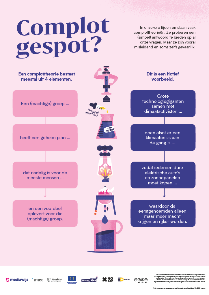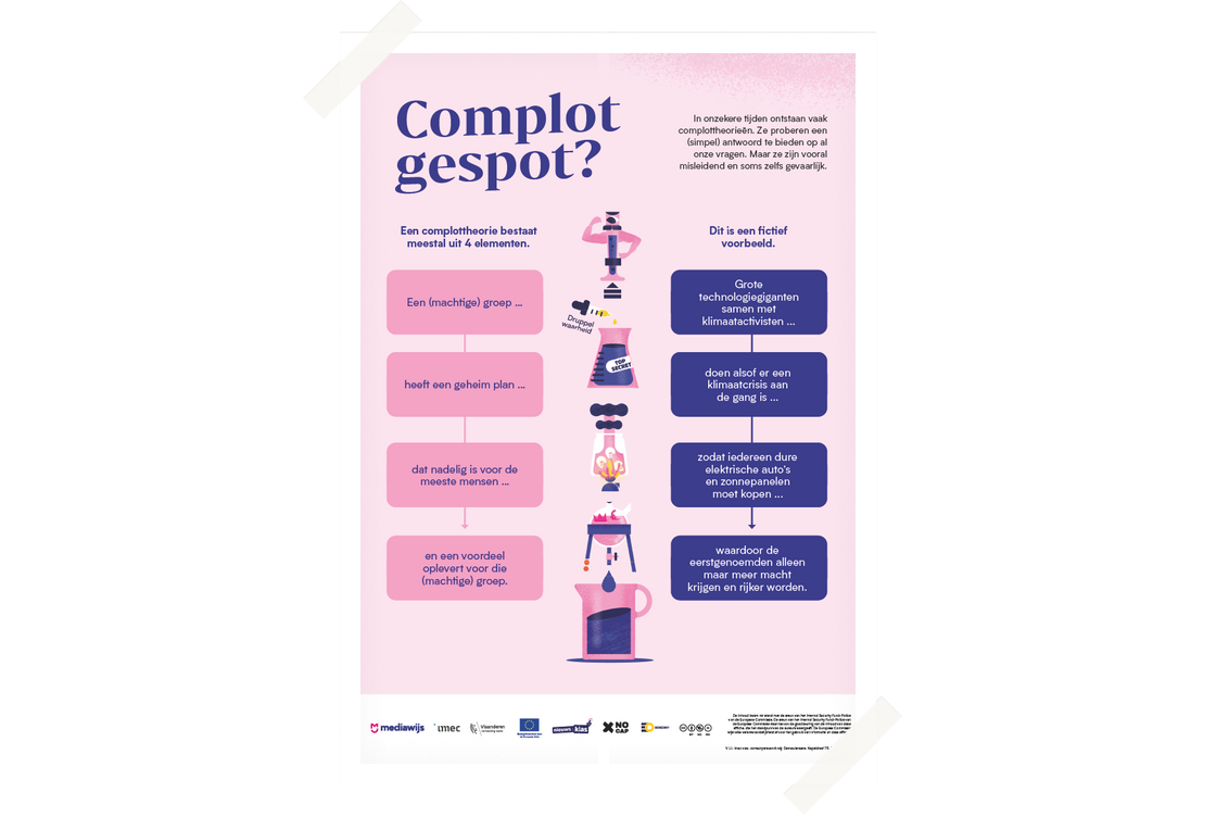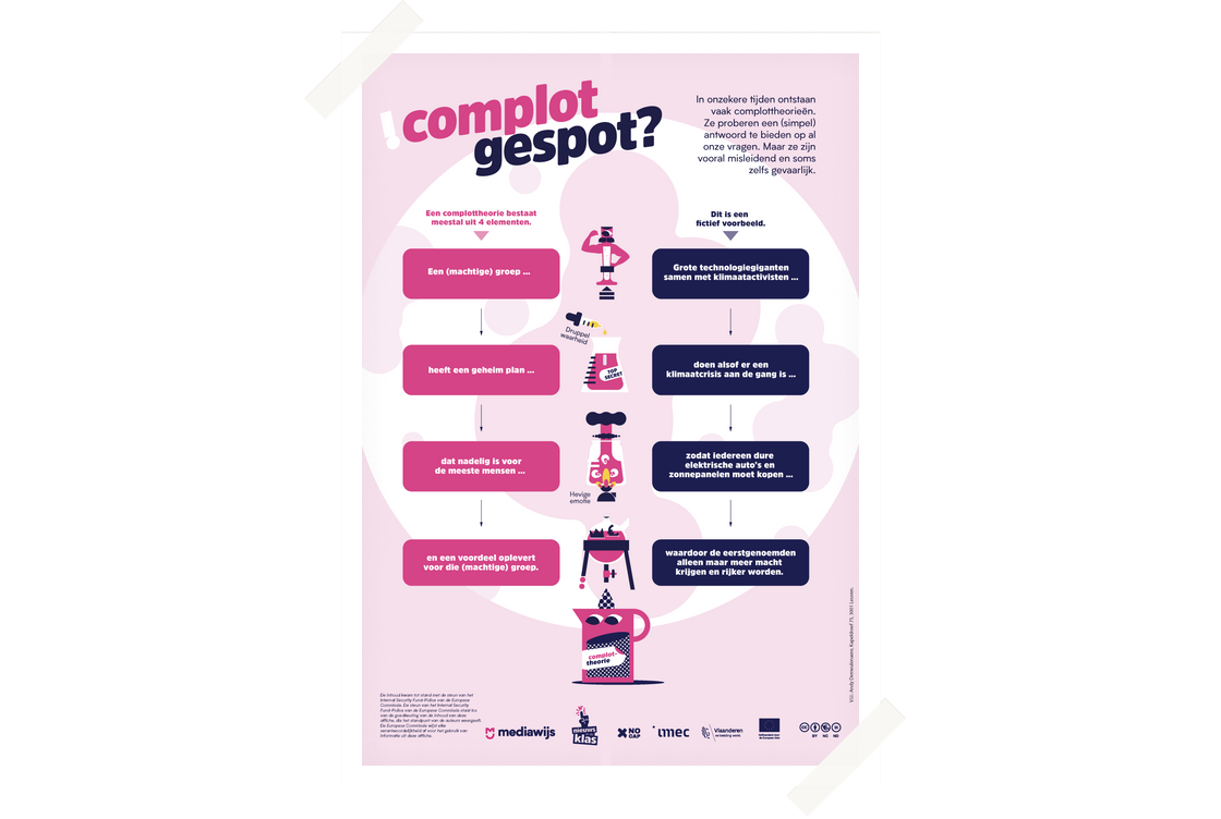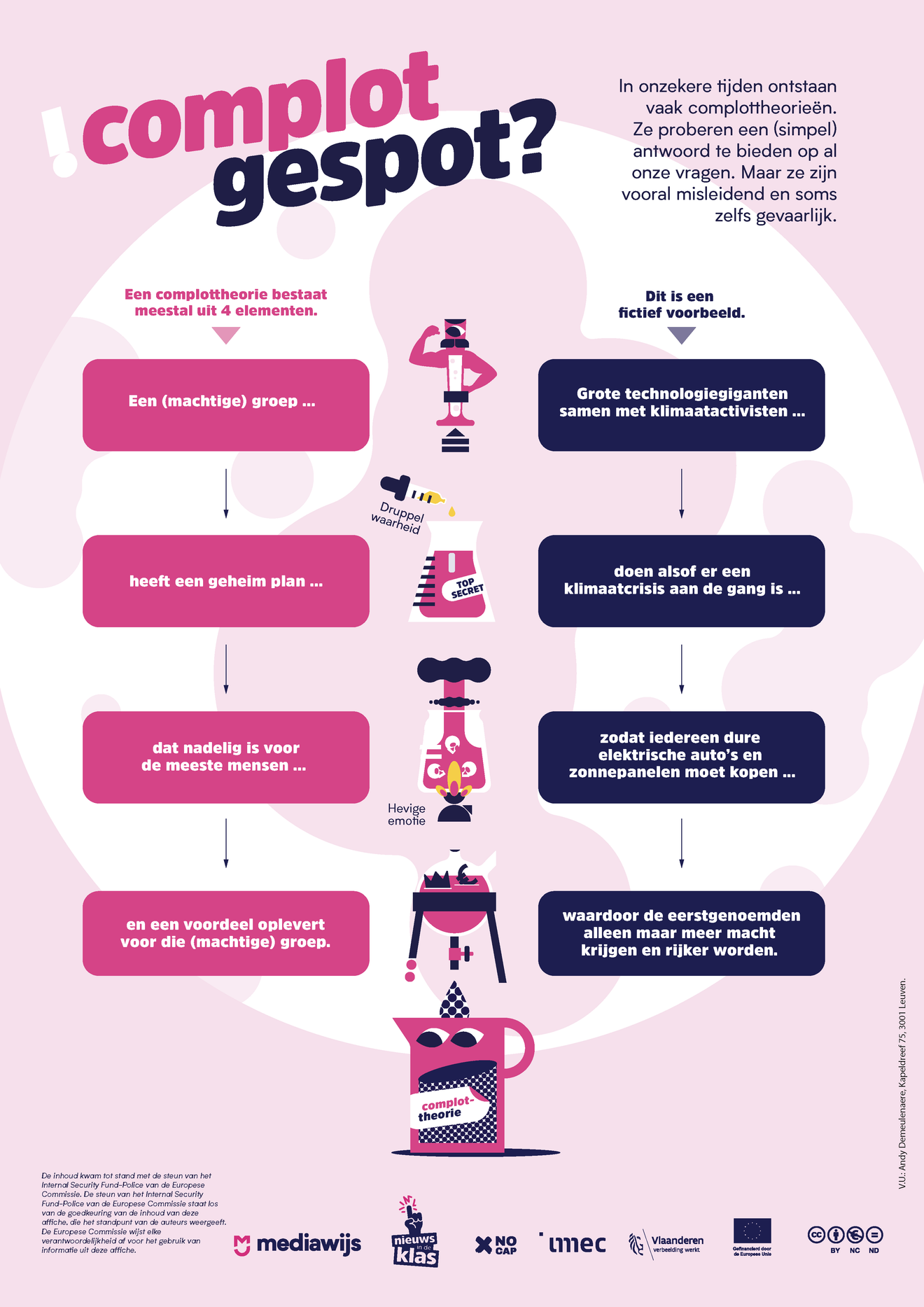 Deze affiche geeft jongeren en volwassenen inzicht in de vaste structuur van een complottheorie.