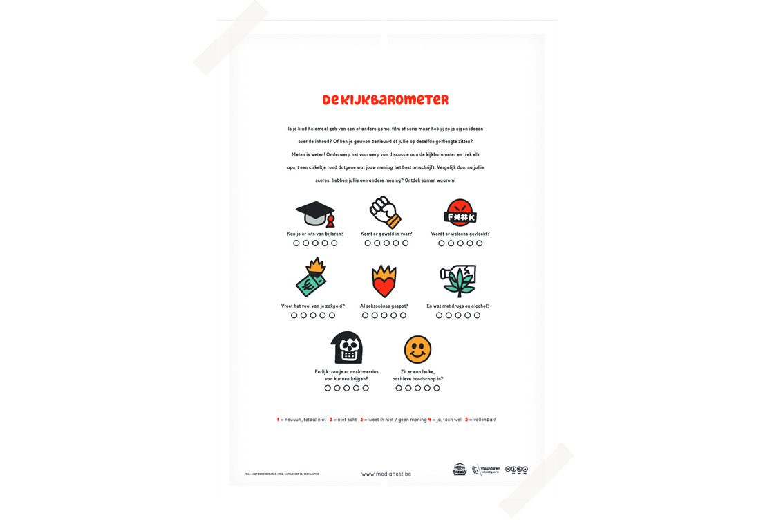 Is je kind helemaal gek van een of andere game, film of serie maar heb jij zo je eigen ideeën over de inhoud? Of ben je gewoon benieuwd of jullie op dezelfde golflengte zitten? Meten is weten! Onderwerp het voorwerp van discussie aan de kijkbarometer en trek elk apart een cirkeltje rond datgene wat jouw mening het best omschrijft. Vergelijk daarna jullie scores: hebben jullie een andere mening? Ontdek samen waarom!