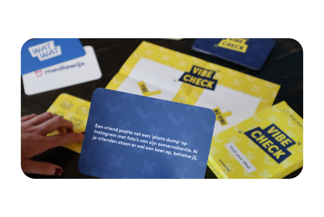 Door het Vibe Check spel leren jongeren reflecteren over de emoties die ze ervaren op sociale media aan de hand van fictieve situaties. Daarnaast krijgen ze goede strategieën aangereikt om met deze emoties om te gaan.