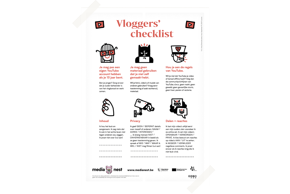 Meer en meer jongeren volgen het voorbeeld van hun grote idolen en richten hun eigen vlogkanaal op. Maar heel wat van hun ouders zitten met vragen. Daarom maakte MediaNest de ‘Vloggers’ checklist’: een toffe klik-en-print die ouders en kinderen een houvast biedt om afspraken te maken over vloggen.